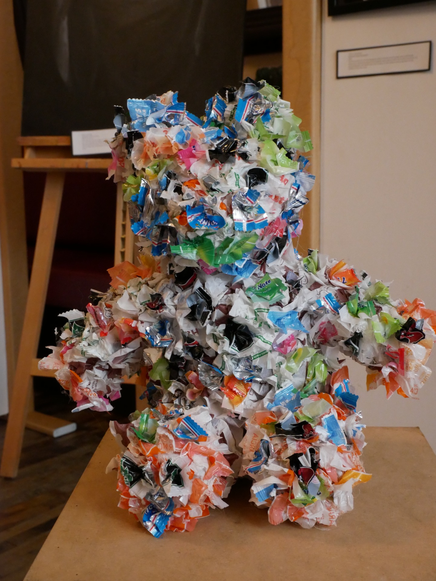 This piece is meant to encompass one of the seven sins, gluttony, where individuals use the consumption of food in order to feel a sense of comfort. In the creation of the bear, candy wrappers were hot glued onto a cardboard base that I constructed to show the extent of desire that one who is gluttonous falls victim to when don't want to feel alone. The symbol of the bear parallels with a child's own innocent need of comfort and familiarity in a teddy bear's company.